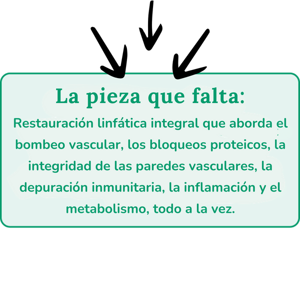 Tu dieta solo atendía lo que entraba en tu sistema (inflamación causada por los alimentos). No reparó la capacidad deficiente de tu cuerpo para drenar lo que ya tenía. Por eso podías comer perfectamente sano y aun así despertar hinchado: los desechos linfáticos acumulados seguían acumulándose en tus tejidos.